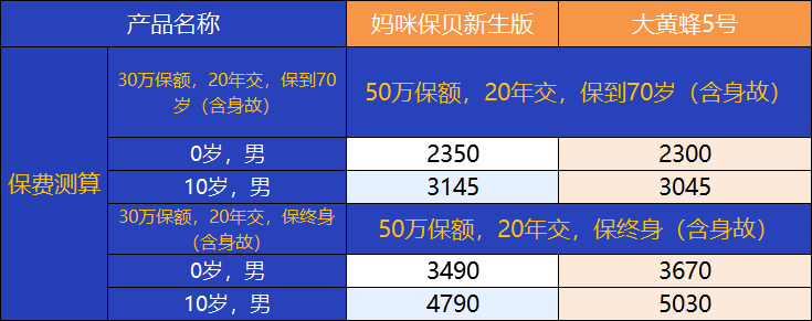 大黄蜂5号保终身和保至70岁时,30岁前有额外赔付50%;保30年的时候,前10年额外赔付50%。妈咪保贝新生版则没有额外赔付的保障。