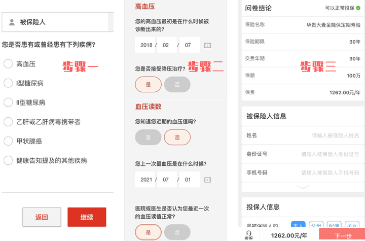 以高血压为例,只要回答确诊时间、是否持续治疗、目前血压值,就可以得出核保结果,并测算好保费。