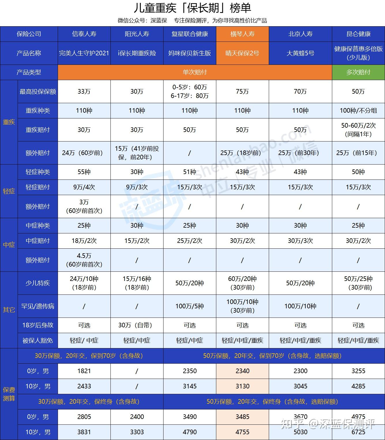 深蓝君挑选了市面热销的儿童重疾险来对比看看: