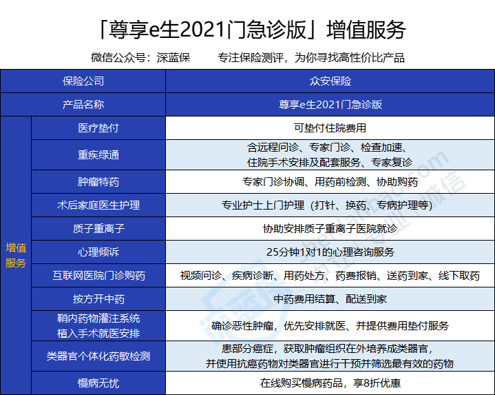 尊享e生2021门急诊版的增值服务多达11种,包含了常见的医疗垫付、重疾绿通、肿瘤特药、术后家庭医生护理等责任。