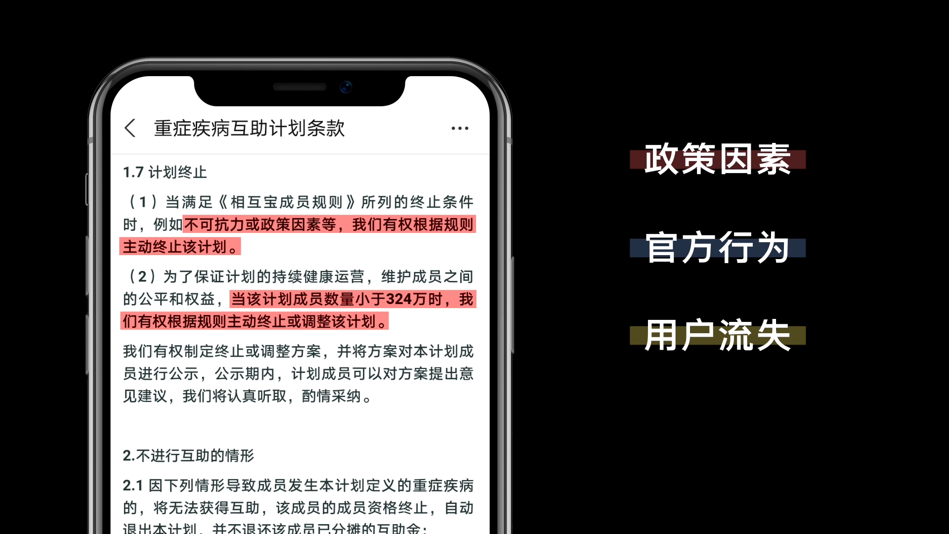 换句话说,就是这类平台受众广、监管弱,如果处理不当会引发社会风险,所以在极端情况下,互助计划是有可能无法持续的。