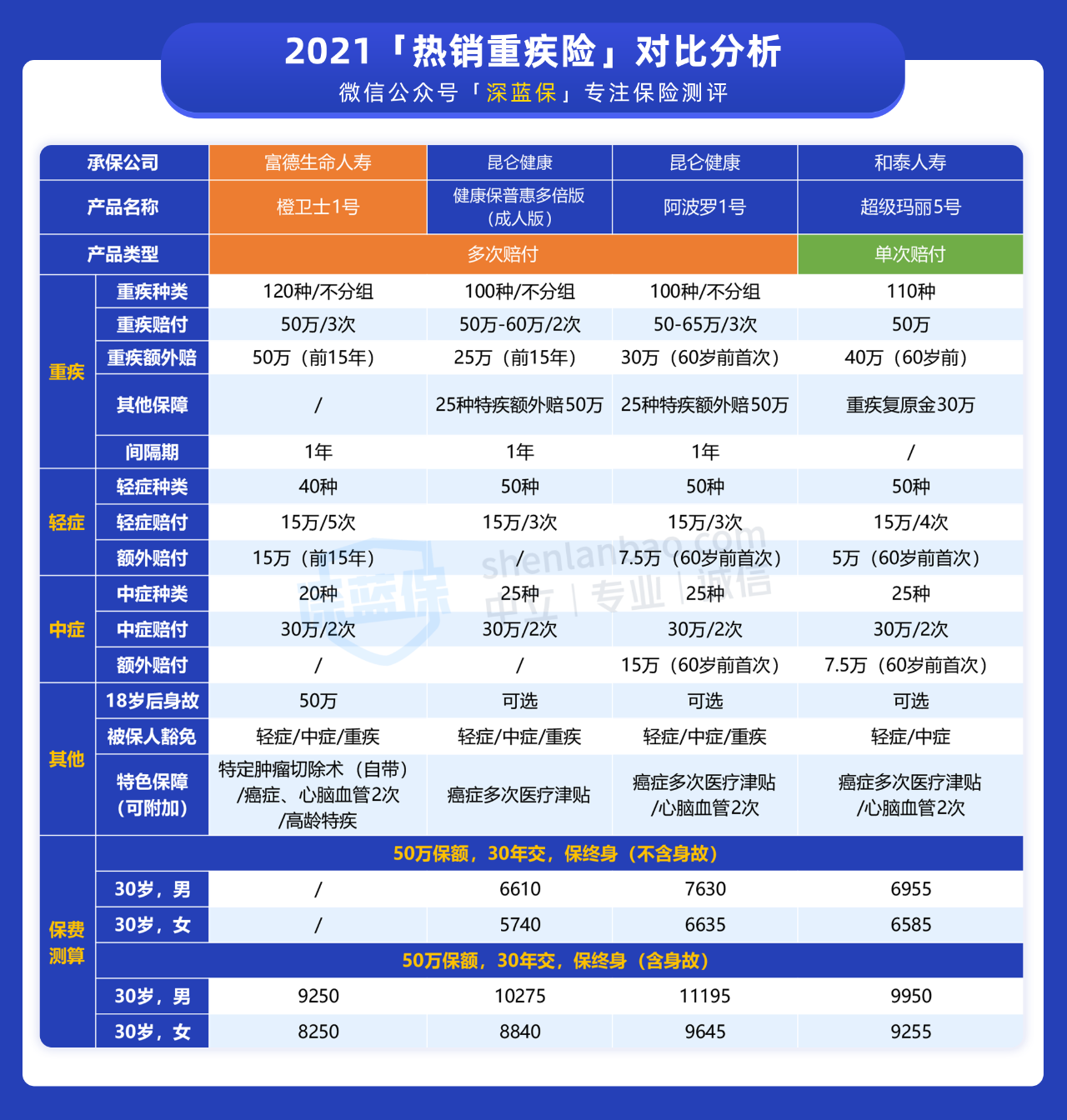 可以看到,在同是卖50万保额,保终身(含身故),分30年交的情况下,30岁的男性女性投保,橙卫士1号都是价格最低的。不过,其余几款重疾险也不错。关于这几款产品,有以下投保建议: