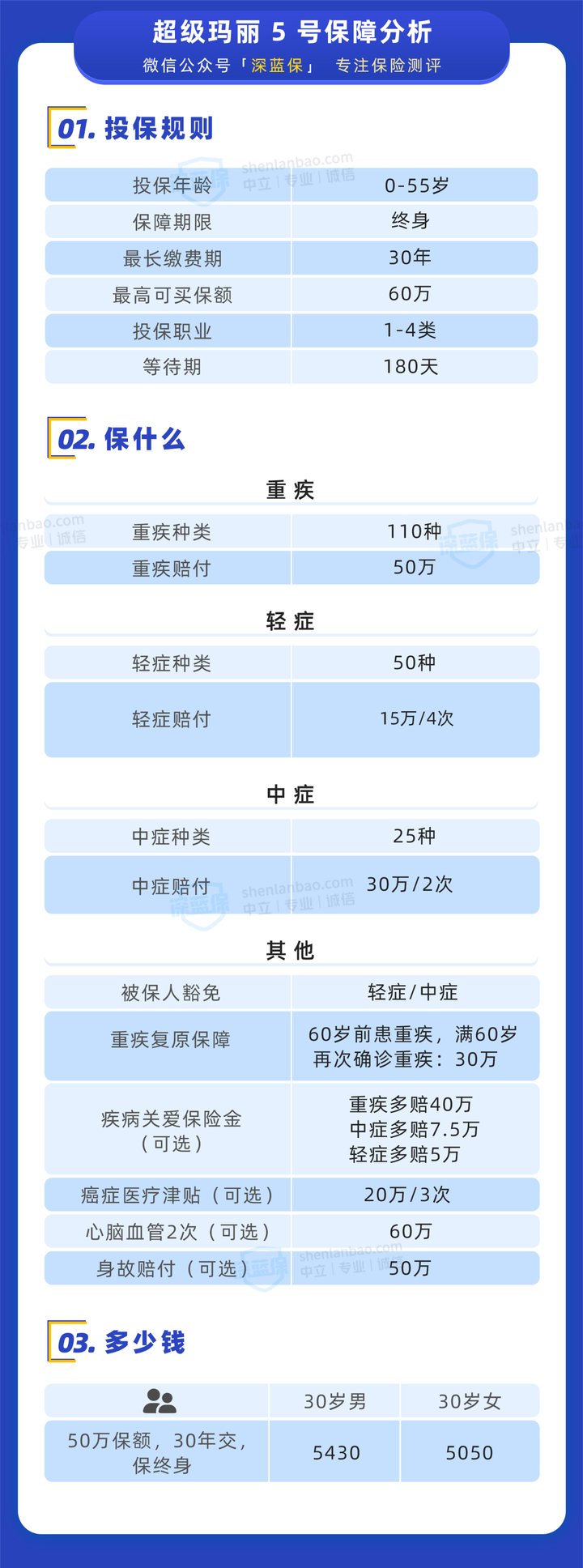 超级玛丽5号, 可以说给了大家一个惊喜,保障全面,除了基本的重疾+轻症+中症,还创新了重疾复原保险金,患同种重疾也能赔,还有很多实用的可选责任,如疾病关爱金、癌症津贴等等,价格不贵,性价比还不错。