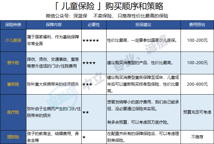 在已经购买医保的情况下,深蓝君建议,根据自己的预算,按照以下顺序给孩子买保险:意外险>重疾险>医疗险>理财保险。