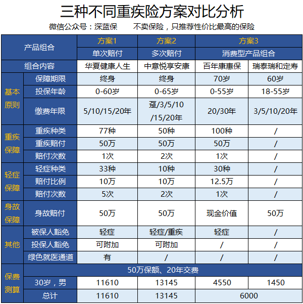 深蓝君建议,康惠保可以搭配一份定期寿险来购买,性价比也很不错。下面给出3种方案进行对比分析,一起来看看有什么差异!
