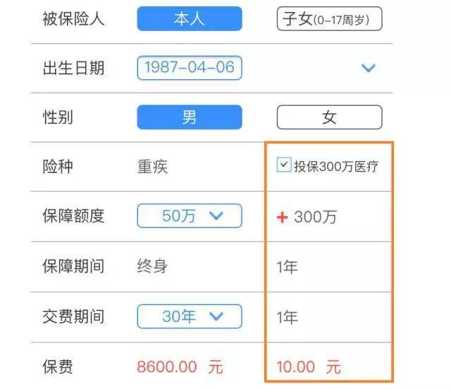 如截图所示,附加300万医疗险,30岁男性首年只需10元,做到这么低的秘诀是免赔额等于保额,所以如果第一次患病后,重疾险的保额不足以支付医疗费用,那么医疗险还可以继续报销。不管用不用的上,这便宜的价格也算是值了!