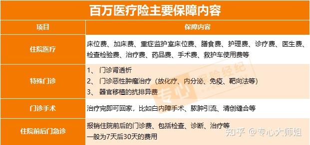 百万医疗险的核心保障主要有4点:住院医疗、特殊门诊、门诊手术和住院前后门急诊。
