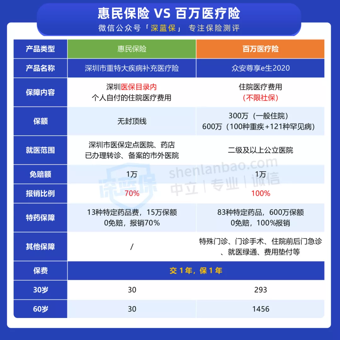 惠民保属于 “低配版” 的百万医疗险。以深圳 30 元大病补充医疗为例,看下它和百万医疗险的区别: