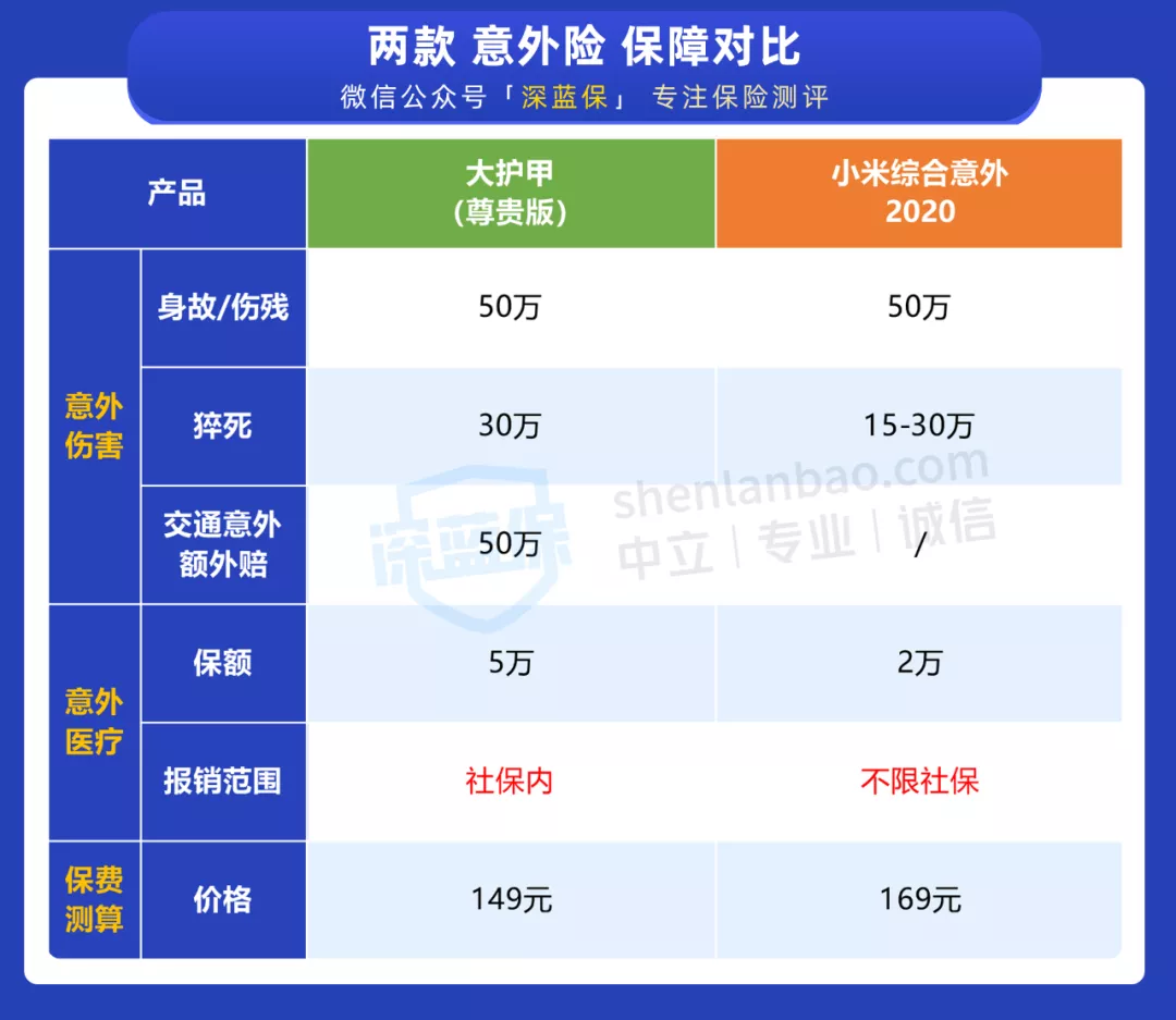 意外险不仅便宜,杠杆也非常高。我们通过两款报销限制不同的意外险来对比,看看它们的保障: