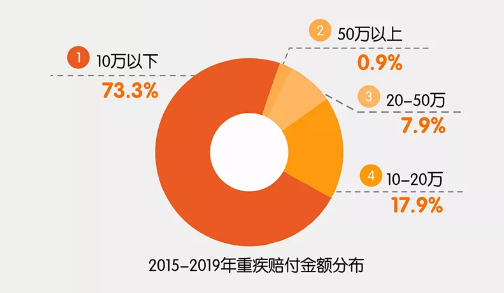 如图所示,高达 73.3% 的人重疾保额在 10 万以下,50 万以上的只有 0.9%,保额配置普遍偏低。
