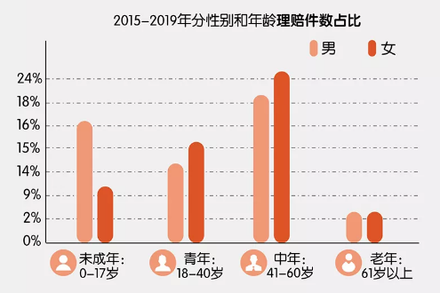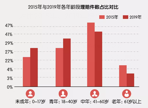 在平安公布的 5 年理赔数据中, 2019 年中青年重疾理赔件数,占比超过 70%。40 岁(含)以下人群,重疾赔付件数明显上涨。