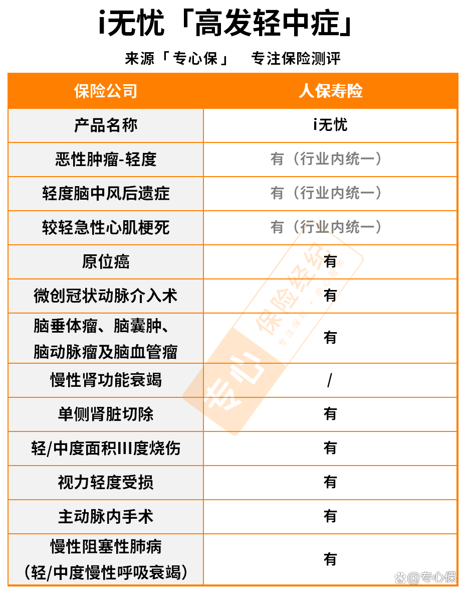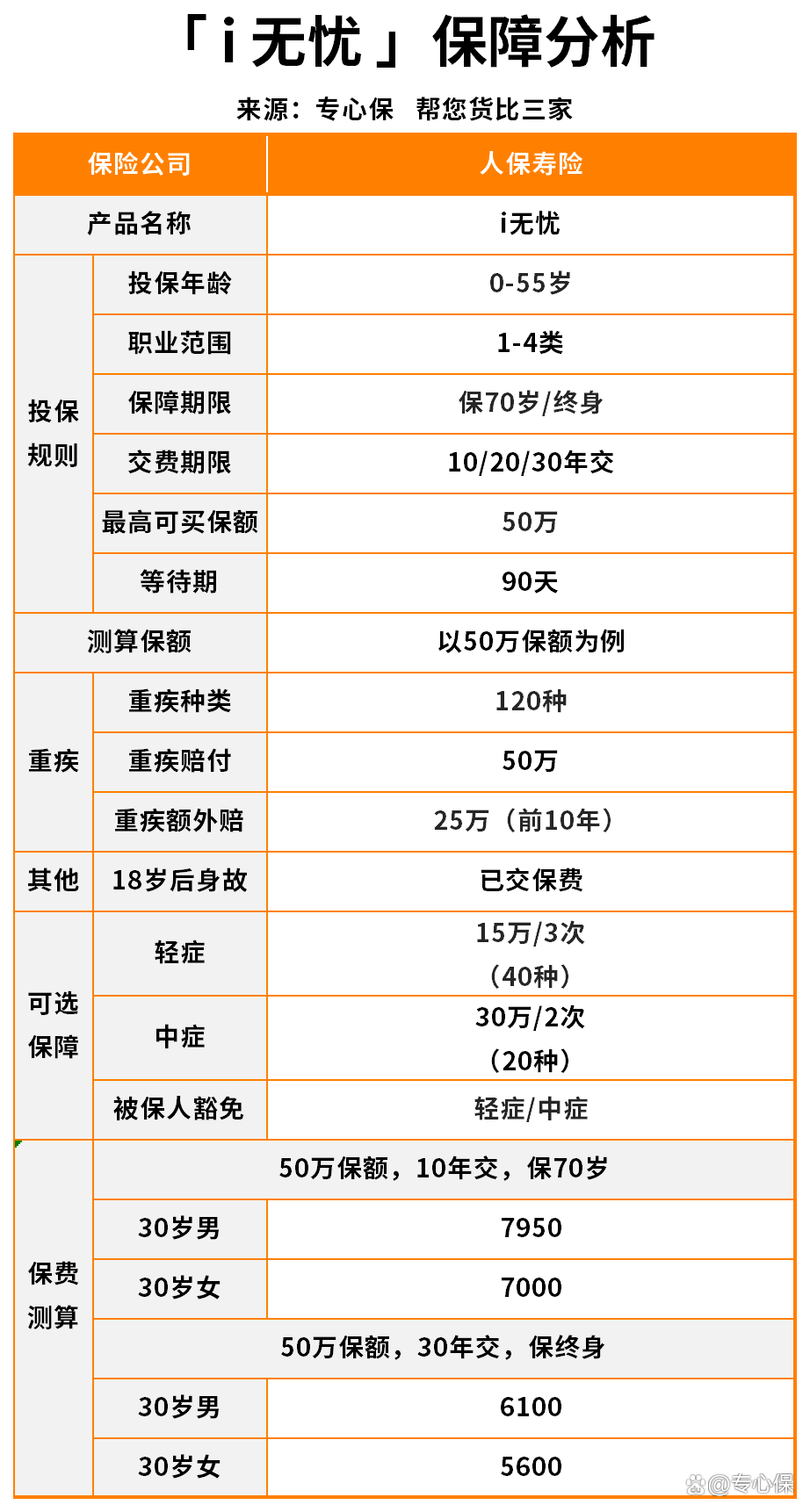 以往,线下大保司的重疾险因为保费过高,保障配不上价格而被人骂。 在这次互联网保险新规后,部分老牌保险公司改头换面,交出令人满意的答卷, 其中,以人保i无忧重疾险(互联网专属)首先受到表扬, 不仅价格适宜、对一些现代常见疾病的核保还很宽松! 别的不说,就说最常见的甲状腺结节,即使没做分级、满足其他条件都能买! 下面,我将从基础保障、核保、承保的公司三个方面出发,给大家深扒这款人保寿险i无忧重疾险(互联网专属),看看它到底怎么样。 (1)等待期只有90天 大部分重疾险的等待期较长,有近半年的等待期, 而i无忧重疾险(互联网专属)的等待期只有普通重疾险的一半。 这对于本身有点健康异常的人比较友好, 早点过等待期,保障可以早点生效,降低在等待期出险导致拒赔的概率。 (2)侧重长期保障 i无忧可选保至70岁或者保终身,可以看到,i无忧更加侧重长期保障, 如果预算有限,选保70岁,至少做好退休前的保障; 如果想一步到位、钱也够,选保终身,毕竟重疾年龄越大发生率越高,保终身更稳妥。 (3)重疾额外赔 i无忧重疾险(互联网专属)在投保的前10年,首次患重疾可以多赔50%保额, 也可以理解为i无忧多给了个保10年的定期重疾险。 比如小王买了 50 万 i 无忧,不幸两年后得了肺癌,那么可以获赔 75 万。 更高的保额,意味着更好的抗风险能力, 在看病疗养期间,就算收入中断,也有足够的钱去维持生活水平。 总之,保额多多益善。 (4)高发轻中症保障全、自由附加 i无忧(互联网专属)重疾险的轻、中症责任灵活,可选可不选, 不选,适合用来加保重疾保额的朋友; 选上,部分疾病未达到重疾也能理赔。 小提示: 如果这是你的第一份重疾险,建议你选上,毕竟轻症、中症的理赔也还是蛮高的, 根据理赔数据,轻症、中症的理赔约占重疾险理赔的30%,也就是差不多10份的重疾险理赔里,就有3份是申请的轻/中症赔付。 尤其,i无忧(互联网专属)重疾险的轻中症保障不错, 对于一些高发的轻症、中症疾病,基本都保上了,上车不亏: 不过要提醒一下,i无忧(互联网专属)不保“慢性肾衰竭”的轻症状态。 也就是说,“慢性肾衰竭”必须达到重疾里的尿毒症状态,才能以重疾去理赔, 如此一来,这项疾病的理赔难度会高一些。 因此,不建议有三高和肾脏家族病史的朋友把这款重疾险作为首选。 总体来说,除了不保“慢性肾衰竭”这项轻症的缺点以外,i无忧(互联网专属)重疾险的其他基础保障都是不错的。 大多数人应该深有感触,带病投保可以说是一件很烦的事了! 花时间做各种检查不说,一旦碰上核保严格的保司,还得和保司大战三百回合才出的了结果! 更别说万一情况特殊,还可能要加费、除外才能投保,甚至被拒保。 但i无忧对8种常见疾病核保宽松,省去我们不少麻烦。 (1)甲状腺结节,不看分级 i无忧重疾险(互联网专属)不看分级, 只要能证明良性或者功能性结节,就可以正常承保。 证明方式可选穿刺或手术,但如果选穿刺,这个方法就会比较痛苦了, 一来有创口,二来需要局麻或者全麻,痛苦程度高。 考虑到这点,i无忧还同意做核素检查来查看结节情况, 这种方式就比做穿刺轻松多了,只需要把微量放射性药物引导进入身体,然后进行扫描即可。 而且核素检查价格不贵,一般医院在200左右,和做两个彩超价格差不多。 通过以上任意一种方式,只要证明是功能性结节,也可以直接标体投保,甚至做不需要分级。 (2)高血压,条件放宽 一般重疾险,收缩压超过 140,就要被加费。 如果再涉及血脂、BMI 指数、肝功能异常,加费会更多。 i无忧呢,不仅不涉及,收缩压还放宽到了 160。 (3)高血糖,条件放宽 一般来说,空腹血糖超过 6.1,重疾险基本就会拒保。 比如达尔文6号,需要三个月内糖化血红蛋白 + 空腹血糖正常 + 口服葡萄糖耐量试验 OGTT 结果正常,最低标准也要空腹血糖再恢复正常。 而i无忧只要 7.0 以内,就能直接承保。 (4)乙肝病毒携带&小三阳 只要肝功能正常,不管是乙肝病毒携带,还是乙肝小三阳,都有机会继续投保。 (5)腺瘤性肠息肉 腺瘤性息肉是公认的癌前病变,保险公司对有腺瘤性息肉的人通常都是直接拒保, 比如网红超级玛丽6号和达尔文6号重疾险,都买不了。 线下部分保司的产品会稍微好些,还是有机会除外肠道承保的。 而i无忧(互联网专属)就更友好了,只要切除后就可以正常承保。 (6)高度近视/视力下降 很多重疾险都会问到:是否近视800度或1000度以上,如果是的话就除外承保或拒保, 但i无忧不问及近视情况。 (7)肿瘤标志物 不限制。 肿瘤标志物异常是很头疼的指标,基本大部分公司直接拒保,也有运气好直接承保的案例,它的核保是门玄学。 而i无忧重疾险(互联网专属)没有问到这项,能正常承保,也就不用去核保碰运气了。 (8)体检异常 一般的重疾险都会问到1-2年内的体检异常,也就是体检报告上有一点异常,类似血常规、肝功能、肾功能里一些无关痛痒的小项目,都得如实告知。 而i无忧没有问到这些普通的体检异常,没有笼统的、消费者自己不好判断的问题,问到的也都是具体的疾病。 所以,如果你只有一些指标异常,i无忧恰好没有问到,也能省去不少麻烦。 如果你的身体有些小毛病,不知道能买什么保险,可以点击下方小程序,预约1名规划师为你做好带病投保的方案规划:1、基础保障:可打8分