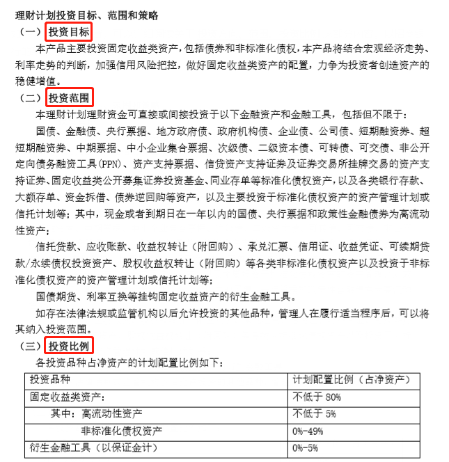 如果你是专业投资者,可以详细阅读关于投资目标、范围、投资比例这部分内容。以招商银行的某款理财产品为例: