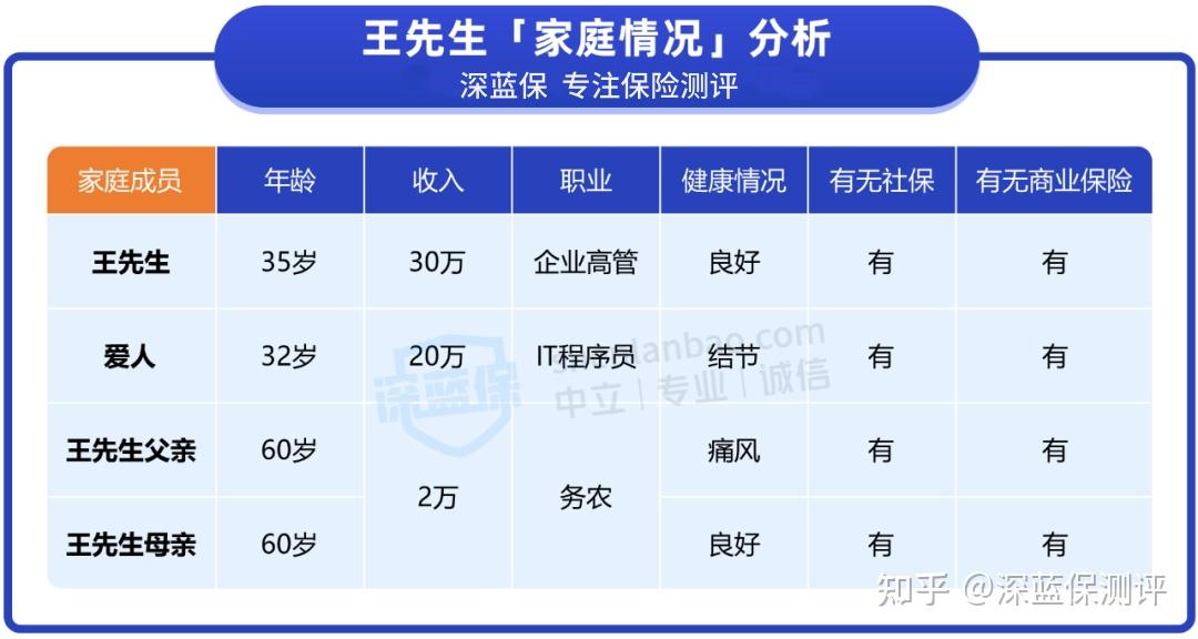 想要配置合适的产品,需要了解王先生的家庭情况和需求,目前他一家的重疾险、百万医疗险、意外险和寿险都配置好了。