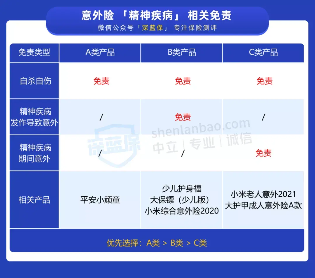 优先选择:A类产品最友好,只对自杀自伤免责,没有针对精神疾病有专门的规定。