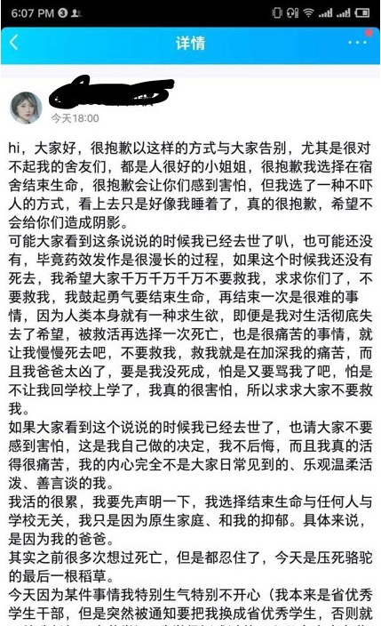 记得此前,济南大学也出现过女大学生因抑郁服药自杀的事件。