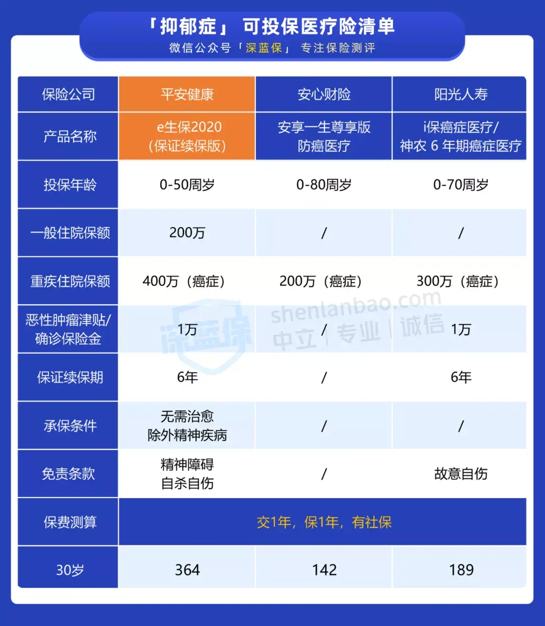 想要保障最好:建议选择平安e生保,这款产品对抑郁症投保较宽松,不需要治愈,抑郁症患者也能买,不过所有精神类疾病都会除外,是为数不多能投保的百万医疗险。
