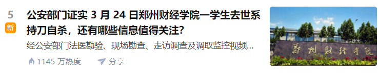 3月24日,郑州财经学院一男生在公寓内持刀自杀。