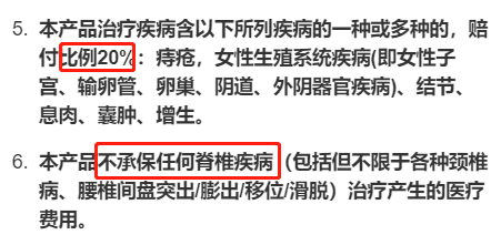 一般包括职业限制、投保区域、等待期、犹豫期、投保年龄、产品条款名称等。有的医疗险还特别约定了针对某些疾病的医疗费报销比例,例如