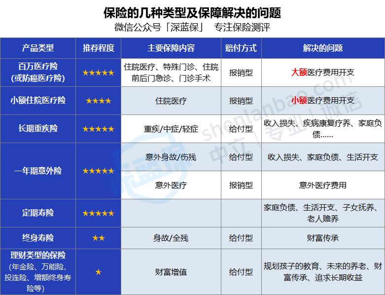 如果不知道自己该买哪一类保险,那么你可以对照这张表格,判断自己的需求,然后选择对应的保险类型。