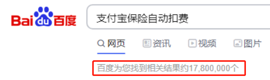 打开手机,再百度一下最常见的“支付宝保险自动扣费”这个问题,就能发现,网上竟存在多达1780万条相关结果: