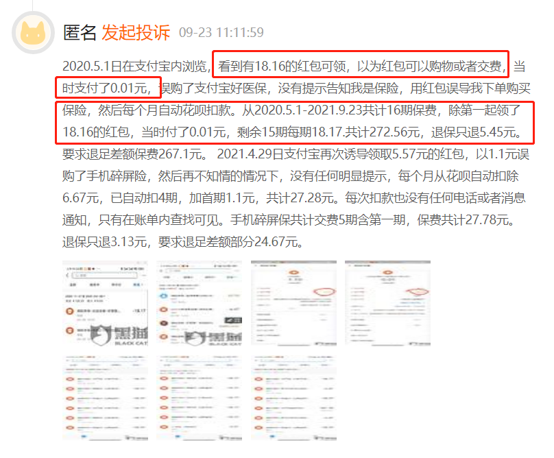 比如有网友投诉,称自己收到红包后,首月支付了0.01元买了好医保。
