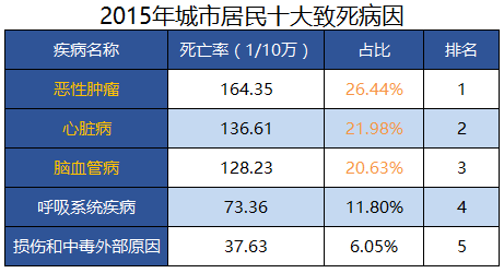 如果单独统计某个器官的重疾发病率,其实心脏和脑血管疾病是占比非常高的,下图是深蓝君整理的2015年城市居民十大致死病因,我们可以看到致死病因中心脏病和脑血管疾病累计之和是超过癌症的。