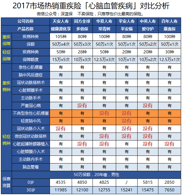 为了方便大家进行挑选,深蓝君也对比了几款保险心脑血管疾病的覆盖情况,方便大家直接的查看: