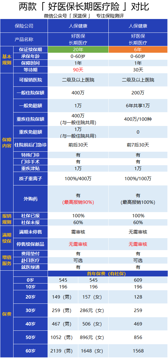 以上就是好医保长期医疗6年版与20年版的不同。可以看出,好医保长期医疗6年版在疾病保障力度上更胜一筹,而20年版的在续保条件上占绝对优势,但两款都是非常优秀的产品。