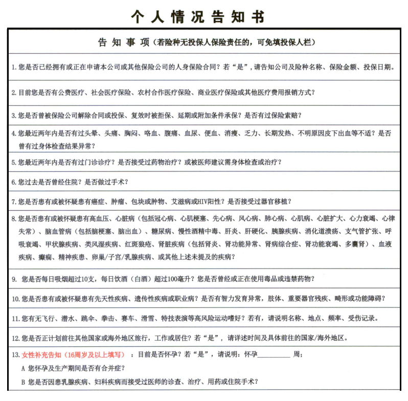 除了购买线上的互联网产品,很多朋友也会投保线下的产品,一般线下产品的的如实告知都是通过问卷的方式进行,下图是深蓝君找到的某产品问卷: