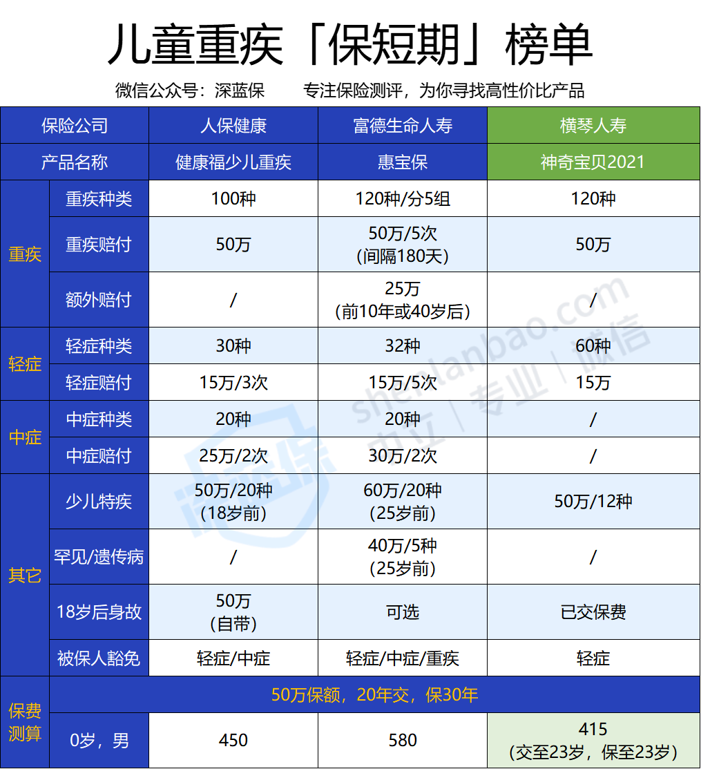 如果追求身故保障,深蓝君更建议大家补充一份定期寿险。给儿童购买,价格不贵,且即便患上重疾,日后也不会影响身故的赔付。