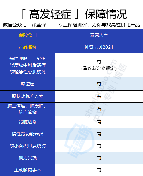 可以看到,泰康神奇宝贝2021对于高发轻症的覆盖率是100%,对高发轻症的保障还是比较全面的。