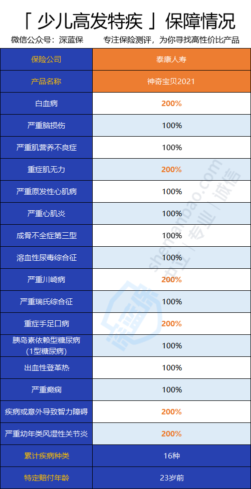 泰康神奇宝贝2021保障了12种少儿特疾,首次确诊这12种的一种或多种,就能额外赔付100%保额。