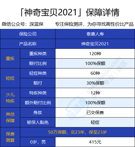 泰康神奇宝贝2021,是一款针对少儿的短期重疾险,保障简单,有重疾、少儿特疾、轻症等保障,自带身故责任,但缺乏了中症保障,保障不够全面,性价比一般。