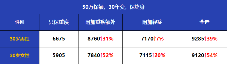 附加轻症涨幅对男性来说变化不大,但对女性来说就比较高了,女性购买时附加轻症性价比不高。