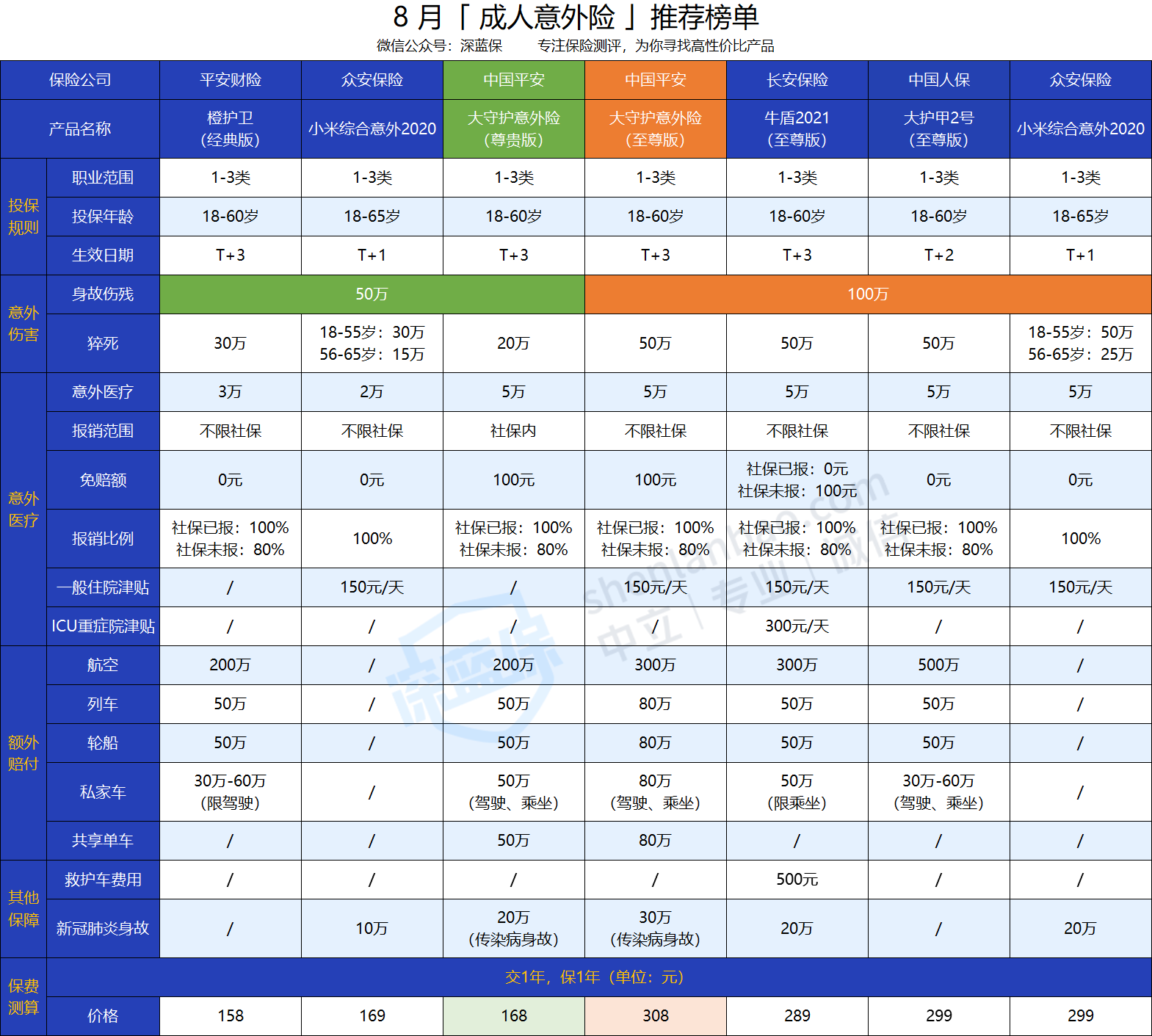 - 如果追求高性价比:平安大守护意外险(至尊版)、平安橙护卫意外险、人保大护甲2号都可以考虑,意外医疗的报销条件都不错,不限社保、0免赔,价钱都不贵,性价比很高。
