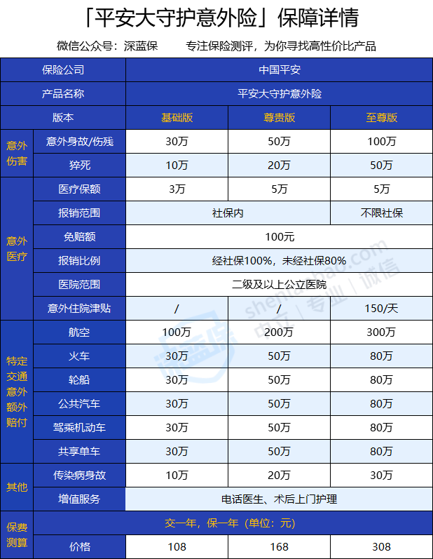 它有3个版本,保额最高能买100万,保障很全面,猝死和传染病身故都能赔,还有特定交通意外额外赔附等责任,价格也不贵,性价比很高。