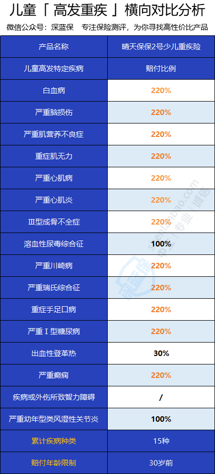 晴天保保2号定位为少儿重疾险,我们再来看看常见的16种高发儿童重疾是否覆盖了。它的高发儿童重疾覆盖情况如下: