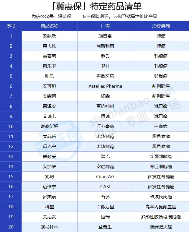 除此之外,如果治疗过程中用到了 20 种 医保目录外 的特定药品,没有免赔额,直接报销 80%。