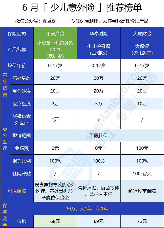 - 如果看重意外医疗:首选大保镖Ⅱ(少儿版),意外医疗保额高达10万,不限社保范围报销,还有意外住院津贴,价格也便宜。
