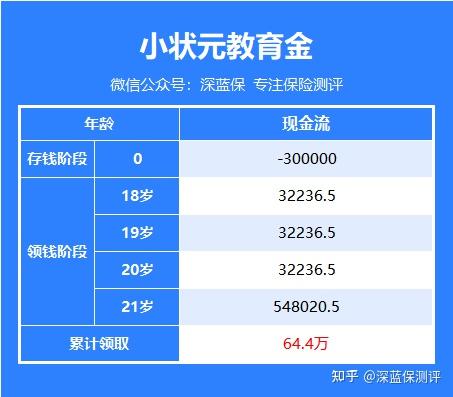 在宝宝0岁的时候一次性支付30万,从18岁到21岁期间,总共可以领取64.4万,翻了2倍不止。