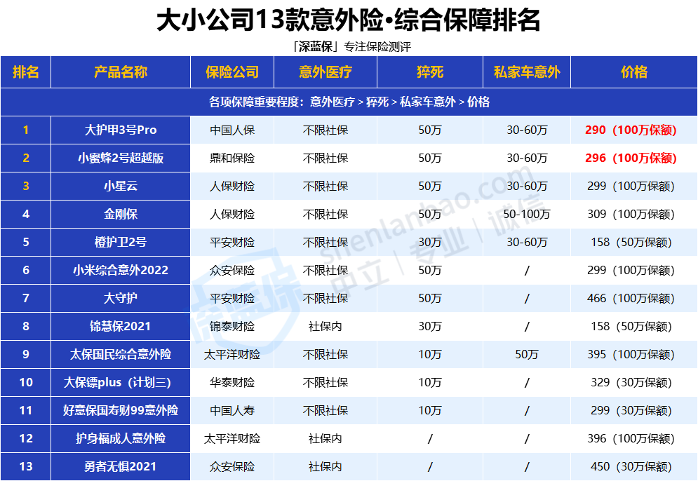 通过对:“意外医疗、猝死、私家车意外、价格”几项重要保障的对比,排名前3的为大护甲3号Pro、小蜜蜂2号超越版、小星云,大公司产品占其二,抛开品牌不说,大公司产品依然能够胜出。