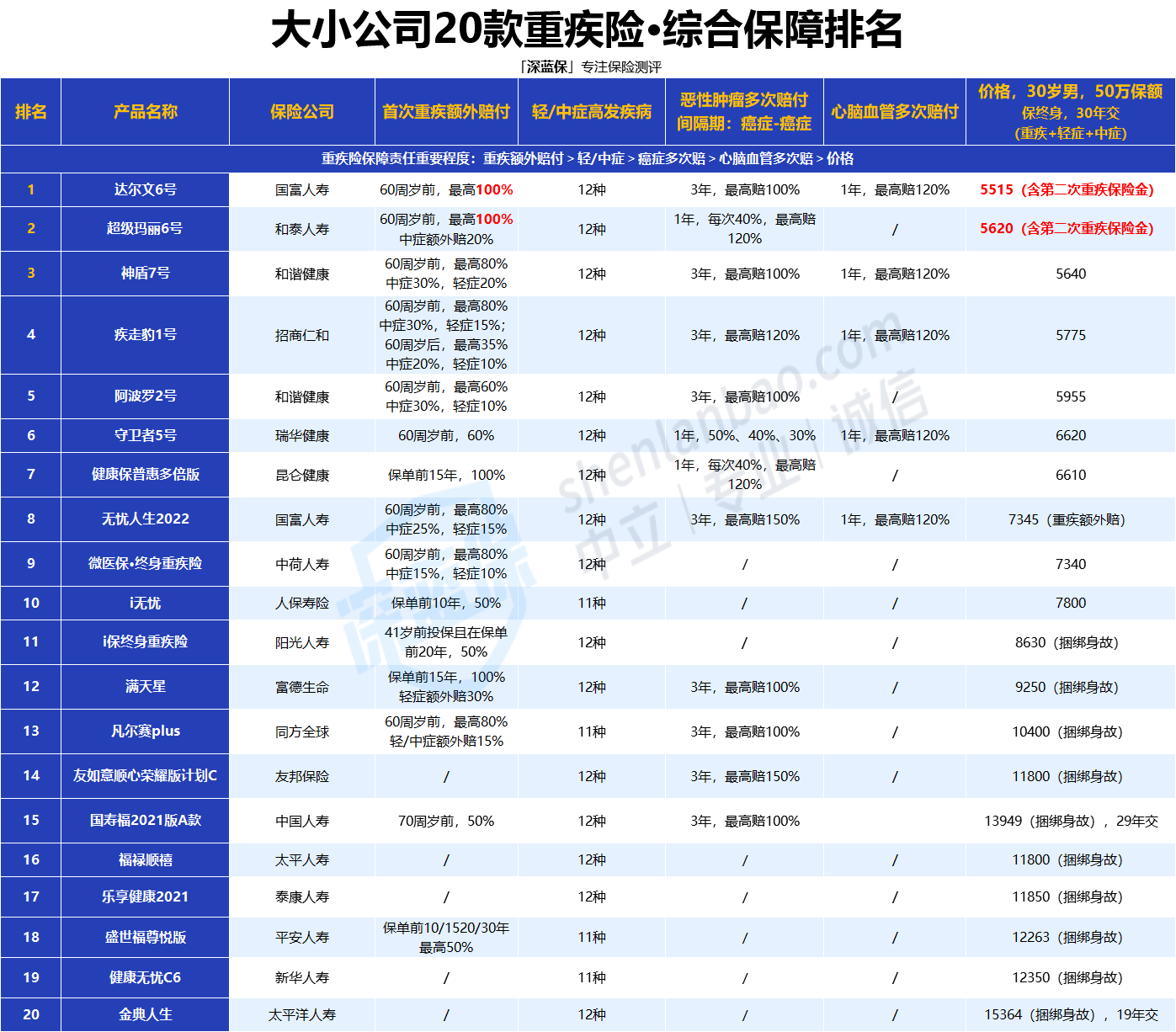 通过对:“重疾、轻症/中症、癌症多次赔、心脑血管多次赔、价格”几个维度的对比,排名前三的为达尔文6号、超级玛丽6号、神盾7号,说实话,那些“小”公司的产品确实更胜一筹。