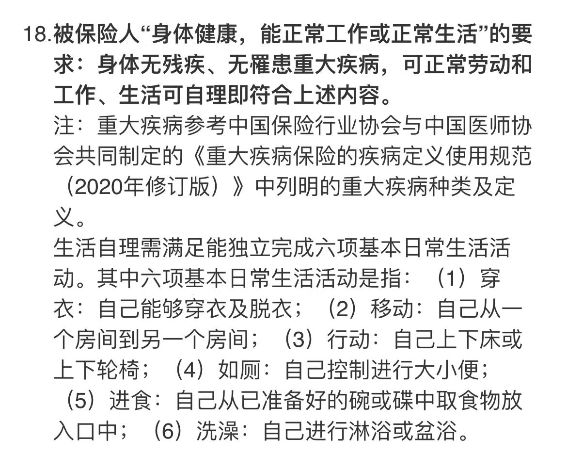 要求被保险人身体无残疾、无罹患重大疾病、可正常劳动和工作、生活可自理。