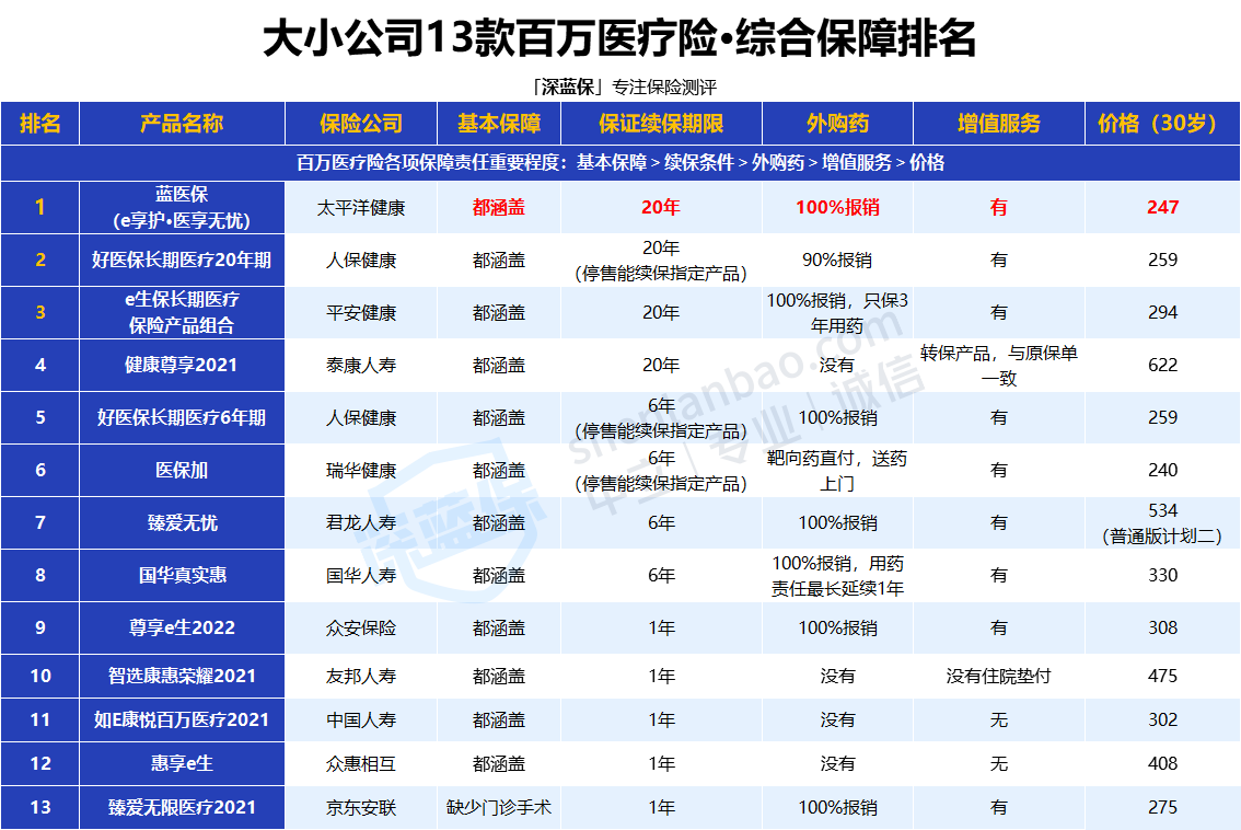 通过对:“基本保障、续保条件、外购药、增值服务、价格”的对比,排名前三的分别是太平洋的蓝医保、人保健康好医保长期医疗险、平安e生保长期医疗险。