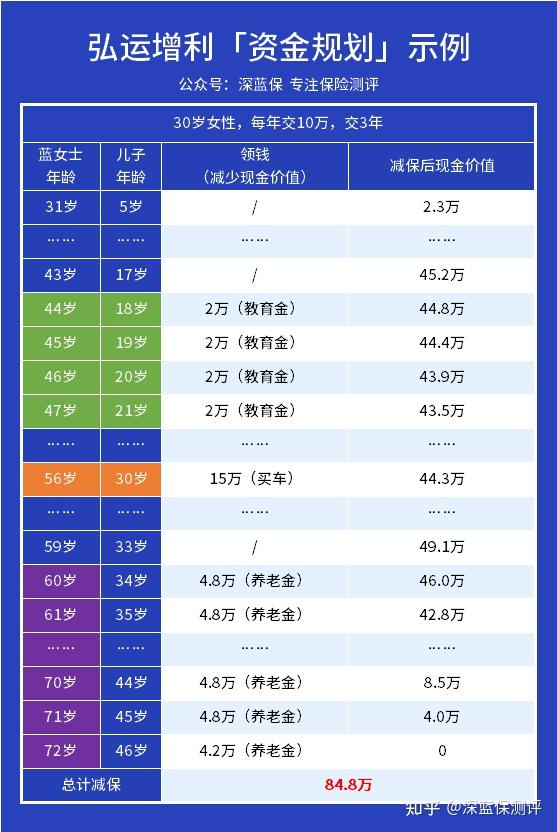 为了方便大家理解,深蓝君以这段时间比较热门的弘运增利为例,演示一下增额终身寿险的收益: