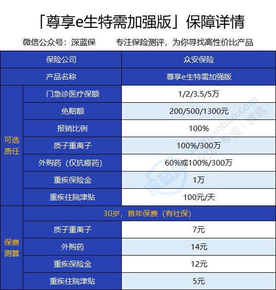 尊享e生特需版有门急诊医疗、质子重离子、外购药、重疾保险金及重疾住院津贴这几项可选责任,还是很丰富的。