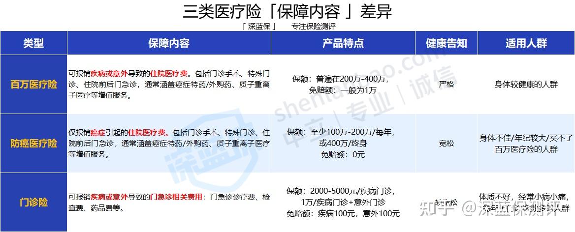 ● 保障内容全面:百万医疗险>防癌医疗险>门诊险