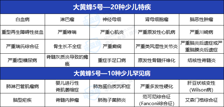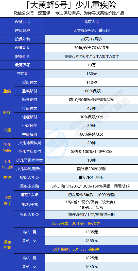 大黄蜂5号涵盖下表所列的20种少儿特疾和10种罕见疾病。特疾选保30年版本的,可额外赔100%;选保至70岁/终身版本,前30年额外赔150%,30年后额外赔100%。