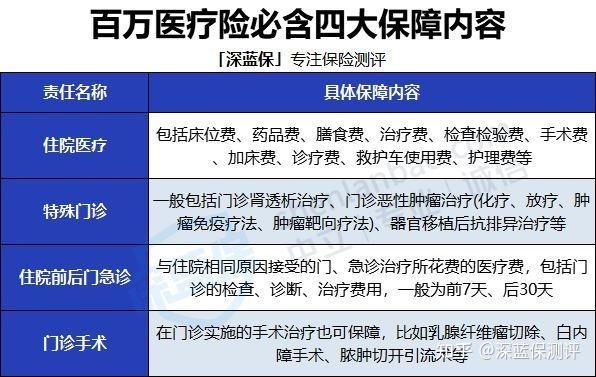 一款合格的百万医疗险,有四大基础保障:住院医疗、特殊门诊、门诊手术、住院前后门急诊。